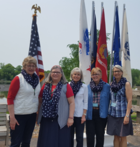 Early in the day they placed hundreds of American flags along the walkways to the outdoors program. Other members escorted residents in wheelchairs from their rooms to shady spots under tents. After the patriotic program of music and speeches, DAR members helped with serving picnic lunches to those unable to stand in line.